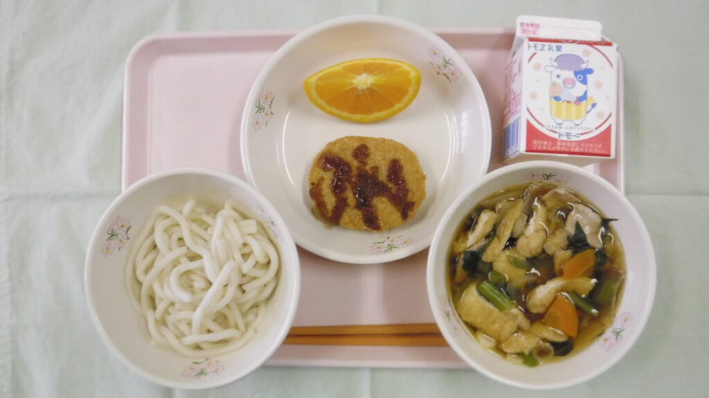 きつねうどん、牛乳、ミートかぼちゃフライ、オレンジです。